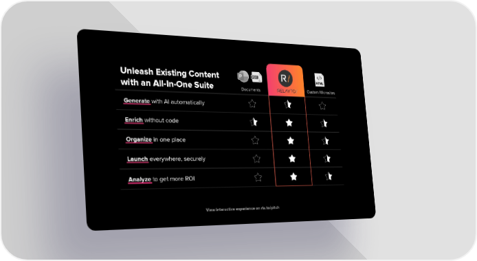 Unleash Existing Content with an All-In-One Suite Documents Custom Microsites Generate with AI automatically Enrich without code Organize in one place Launch everywhere, securely Analyze to get more ROI View interactive experience on rla.to/pitch
