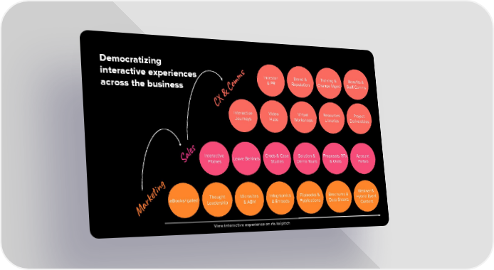 Democratizing Investor Brand & Training & Benefits & interactive experiences & PR Reputation Change Mgmt Staff Comms across the business X & Comms C Interactive Video Virtual Resources Project Journeys Hubs Workshops Libraries Deliverables Interactive Creds & Case Solution & Proposals, RFx Account ales Leave Behinds Pitches Studies Demo Tours & Orals Portals S Webinar & Thought Microsites Infographics Flipbooks & Brochures & eBooks/ gated Hybrid Event Leadership & ABM & Embeds Publications Data Sheets Content Marketing View interactive experience on rla.to/pitch Q4 2018 Q1 2019 Q2 2019 Q3 2019