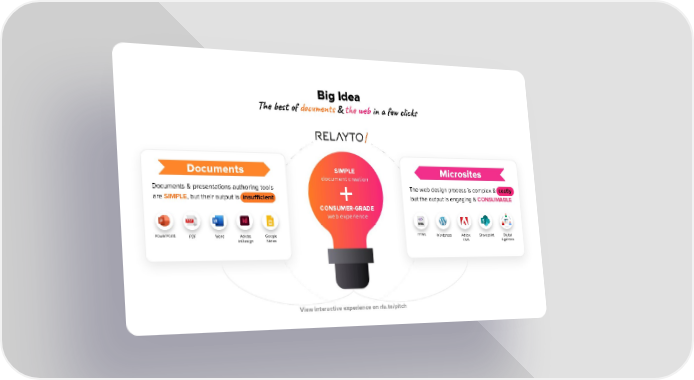 Big Idea The best of documents & the web in a few clicks SIMPLE Documents Microsites document creation Documents & presentations authoring tools The web design process is complex & costly are SIMPLE, but their output is insuļ¬cient but the output is engaging & CONSUMABLE CONSUMER-GRADE web experience PowerPoint HTML PDF Word Adobe Google Wordpress Adobe Sharepoint Digital InDesign Slides CMS Agencies View interactive experience on rla.to/pitch
