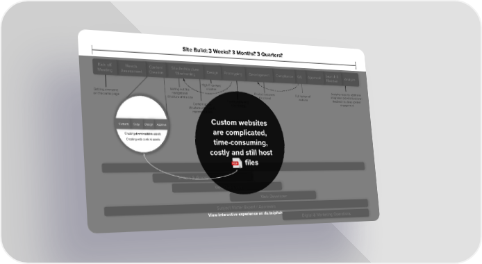 Site Build: 3 Weeks? 3 Months? 3 Quarters? Kick off Needs Content Site Architecture Launch & Design Prototyping Development Compliance QA Approval Analyze Meeting Assessment Creation Wireframing Maintain High-Fi content creation Analytics requires additional Sorting out the Product becomes Full review of Getting everyone integration provide functional navigational functional website on the same page feedback vs. deep content structure of the site Functionality and engagement Content given user-testing structure with Low-Fi representations Custom websites Content Copy Design Approve are complicated, Creating downloadable assets Creating web content assets time-consuming, costly and still host files Project Manager Writers & Graphic Designers Web Designers Web Developer Subject Matter Expert / Approvals View interactive experience on rla.to/pitch Digital & Marketing Operations