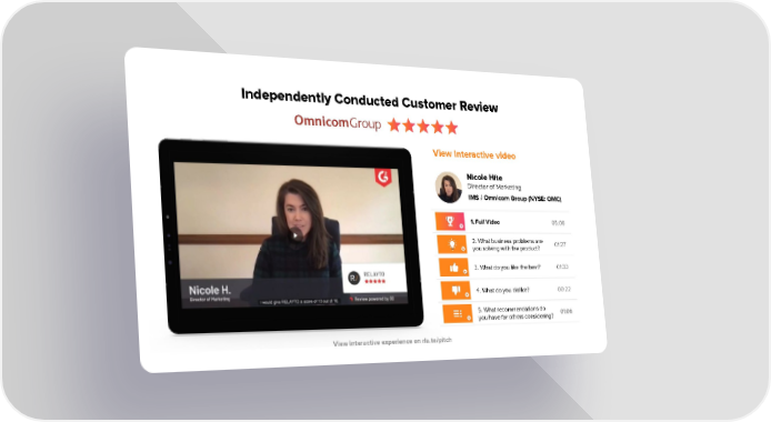 Independently Conducted Customer Review View Interactive video Nicole Hite Director of Marketing IMS / Omnicom Group (NYSE: OMC) 1. Full Video 05:06 2. What business problems are 01:27 you solving with the product? 3. What do you like the best? 01:33 4. What do you dislike? 00:22 5. What recommendations do 01:06 you have for others considering? View interactive experience on rla.to/pitch