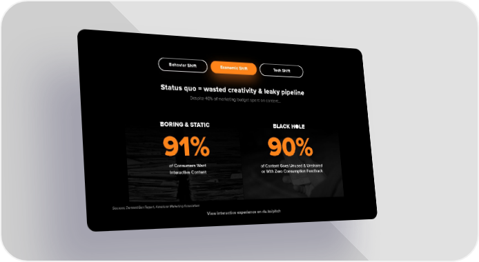Behavior Shift Economic Shift Tech Shift Status quo = wasted creativity & leaky pipeline Despite 40% of marketing budget spent on content... BORING & STATIC BLACK HOLE 91% 90% of Consumers Want of Content Goes Unused & Unshared Interactive Content or With Zero Consumption Feedback Sources: DemandGen Report, American Marketing Association View interactive experience on rla.to/pitch