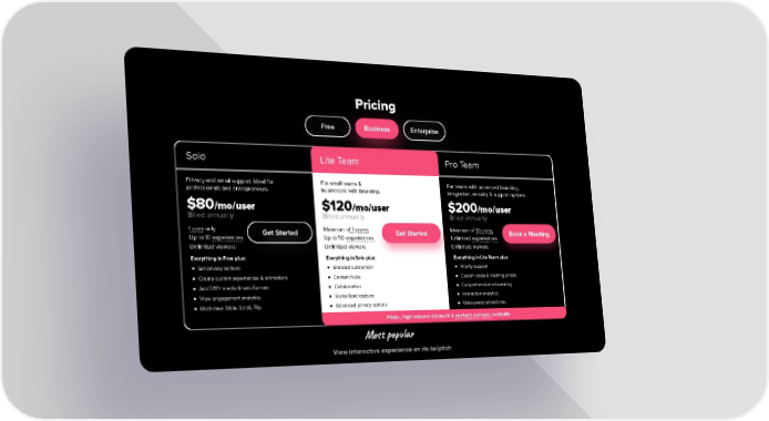 Pricing Free Business Enterprise Solo Lite Team Pro Team Privacy and email support. Ideal for For small teams & For teams with advanced branding, professionals and entrepreneurs. businesses with branding. integration, security & support options. $80/mo/user $120/mo/user $200/mo/user Billed annually Billed annually Billed annually 1 user only Minimum of 5 users Minimum of 10 users Get Started Get Started Book a Meeting Up to 10 experiences Up to 50 experiences Unlimited experiences Unlimited viewers Unlimited viewers Unlimited viewers Everything in Free plus: Everything in Solo plus: Everything in Lite Team plus: ● Set privacy options ● Branded subdomain ● Priority support ● Create custom experiences & animations ● Content hubs ● Custom code & tracking scripts ● Add 500+ media & web formats ● Collaboration ● Comprehensive onboarding ● View engagement analytics ● Visitor/lead capture ● Interaction analytics ● Multi-view: Slide, Scroll, Flip ● Advanced privacy options ● Mass-personalized sites Pilots, high-volume discount & content services available Most popular View interactive experience on rla.to/pitch