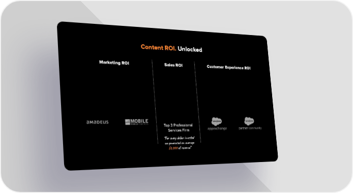 Avg Win Rate: Content ROI. Unlocked 2 x increase Global pursuits and strategic accounts Marketing ROI Sales ROI Customer Experience ROI Top 3 Professional Services Firm Sales pipeline supported Top 3 Professional Services firm worldwide Top 3 Professional Services Firm “For every dollar invested we generated on average $2,000 of revenue”