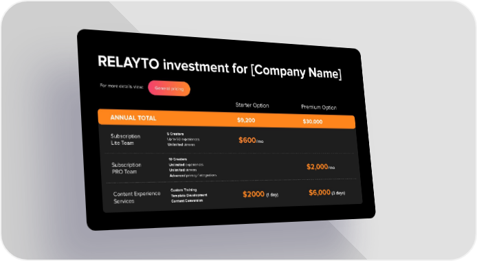 RELAYTO investment for [Company Name] For more details view: General pricing Starter Option Premium Option ANNUAL TOTAL $9,200 $30,000 5 Creators Subscription Up to 50 experiences $600/mo Lite Team Unlimited viewers 10 Creators Unlimited experiences Subscription $2,000/mo Unlimited viewers PRO Team Advanced privacy / integrations Custom Training Content Experience Template Development $2000 (1 day) $6,000 (3 days) Services Content Conversion