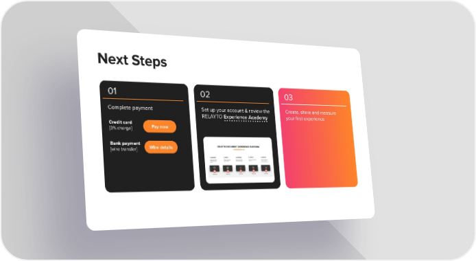 Do you agree with the proposed two-stage solution for the digital destination? -3% 360 plus via credit card now[ stripe links for credit card] -12K via wire transfers / invoice Next Steps Remember you can use comments 01 02 03 button to write feedback and questions. Complete payment Set up your account & review the Create, share and measure RELAYTO Experience Academy your first experience Credit card Pay now [3% charge] Bank payment Wire details [wire transfer]