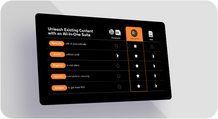 RELAYTO/ Proposal Template [2021 ] Page 9 Page 11Unleash Existing Content with an All-In-One Suite Documents Web Generate with AI automatically Enrich without code Organize in one place Launch everywhere, securely Analyze to get more ROI