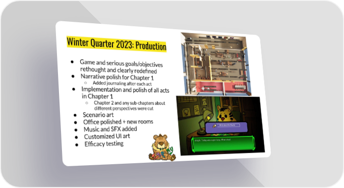 Winter Quarter 2023: Production ● Game and serious goals/objectives rethought and clearly redefined ● Narrative polish for Chapter 1 ○ Added journaling after each act ● Implementation and polish of all acts in Chapter 1 ○ Chapter 2 and any sub-chapters about different perspectives were cut ● Scenario art ● Office polished + new rooms ● Music and SFX added ● Customized UI art ● Efficacy testing
