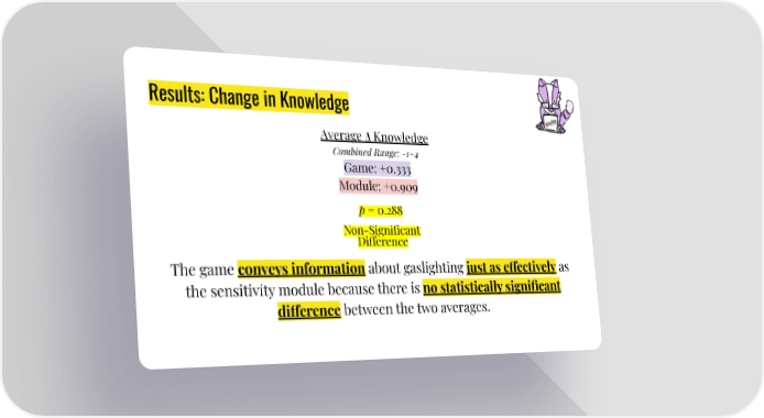 Results: Change in Knowledge Average Δ Knowledge Combined Range: -1~4 Game: +0.333 Module: +0.909 p = 0.288 Non-Significant Di昀昀erence The game conveys information about gaslighting just as e昀昀ectively as the sensitivity module because there is no statistically significant di昀昀erence between the two averages.