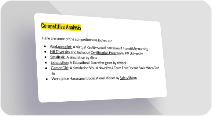 Competitive Analysis Here are some of the competitors we looked at : ● Vantage point: A Virtual Reality sexual harrasment / sensitivity training ● HR Diversity and Inclusion Certification Program by HR University ● Smalltalk: A simulation by rlietz ● Exhaustion: A Educational Narrative game by dfalzoi ● Gamer Girl: A simulation Visual Novel by A Team That Doesn’t Smile When Told To ● Workplace Harassment Educational Videos by SafetyVideos