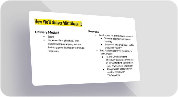 How We’ll deliver/distribute It Reasons Delivery Method ○ Destinations for distribution are various ○ Steam ■ Students looking into the game industry ○ In-person through schools with ■ Employees who are already within game development programs and the games industry industry game development training ○ Best Platform to deliver will be on PC programs and Console ■ PC and Console are both effectively accessible online and in-person for both students and game development employees ■ This game can be played with multiple people with TVs/Monitors.