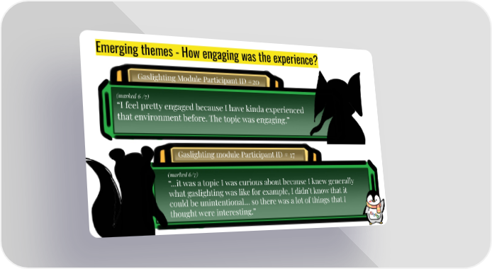 Emerging themes - How engaging was the experience? Gaslighting Module Participant ID #20 (marked 6 /7) “I feel pretty engaged because I have kinda experienced that environment before. The topic was engaging.” Gaslighting module Participant ID # 17 (marked 6/7) “...it was a topic I was curious about because I knew generally what gaslighting was like for example, I didn’t know that it could be unintentional… so there was a lot of things that I thought were interesting.”
