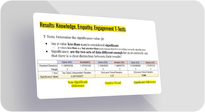 Results: Knowledge, Empathy, Engagement T-Tests T-Tests: Determine the significance value (p) ● Any p value less than 0.05 is considered significant ○ p values less than 0.1, but greater than 0.05 means that it is trending towards significance ● Significance: are the two sets of data di昀昀erent enough for us to correctly say that there is a clear distinction between their results? Non-Significant Positive Trend Significant Di昀昀erence Di昀昀erence