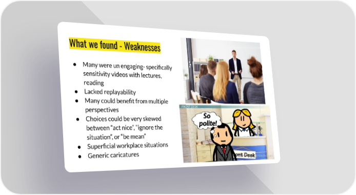 What we found - Weaknesses ● Many were un engaging- specifically sensitivity videos with lectures, reading ● Lacked replayability ● Many could benefit from multiple perspectives ● Choices could be very skewed between “act nice”, “ignore the situation”, or “be mean” ● Superficial workplace situations ● Generic caricatures