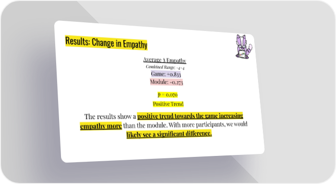 Results: Change in Empathy Average Δ Empathy Combined Range: -4~4 Game: +0.833 Module: -0.273 p = 0.070 Positive Trend The results show a positive trend towards the game increasing empathy more than the module. With more participants, we would likely see a significant di昀昀erence.