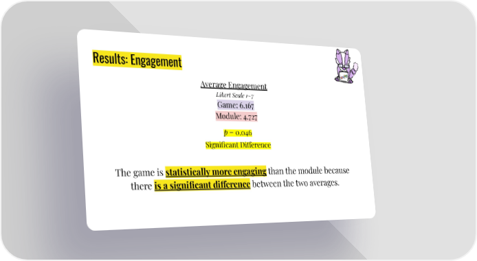 Results: Engagement Average Engagement Likert Scale 1~7 Game: 6.167 Module: 4.727 p = 0.046 Significant Di昀昀erence The game is statistically more engaging than the module because there is a significant di昀昀erence between the two averages.
