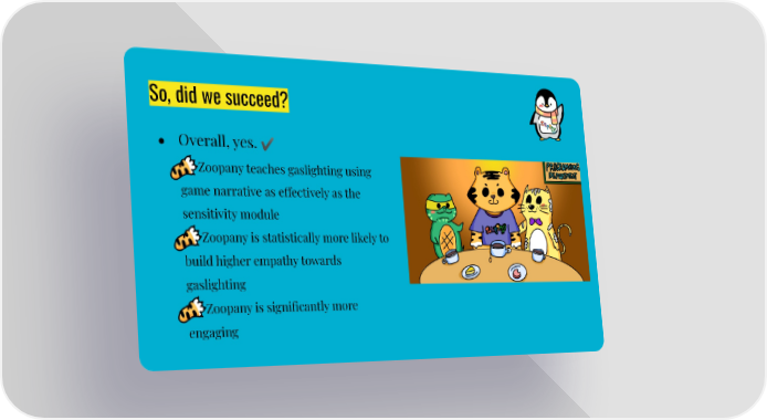 So, did we succeed? ● Overall, yes. ✔ ✔ Zoopany teaches gaslighting using game narrative as e昀昀ectively as the sensitivity module ✔ Zoopany is statistically more likely to build higher empathy towards gaslighting ✔ Zoopany is significantly more engaging