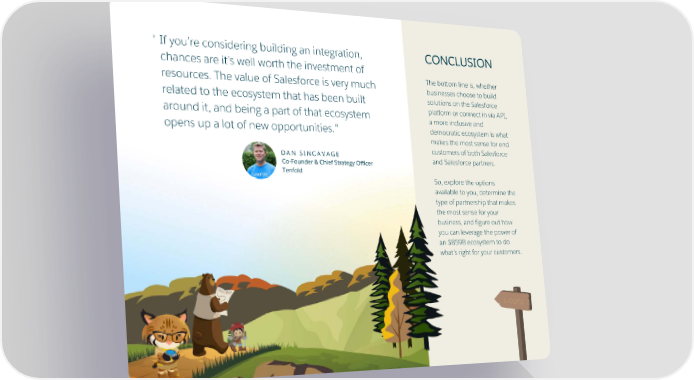 If youąre considering building an integrationâ ê CONCLUSION chances are itąs well worth the investment of The bottom line isâ whether resourcesç The value of Salesforce is very much businesses choose to build solutions on the Salesforce related to the ecosystem that has been built platform or connect in via APIâ around itâ and being a part of that ecosystem a more inclusive and democratic ecosystem is what ê opens up a lot of new opportunitiesç makes the most sense for end customers of both Salesforce DAN SINCAVAGE and Salesforce partnersç Co-Founder & Chief Strategy Officer Tenfold Soâ explore the options available to youâ determine the type of partnership that makes the most sense for your businessâ and figure out how you can leverage the power of an Ċ‘Ž’B ecosystem to do whatës right for your customersç S U C C E S S