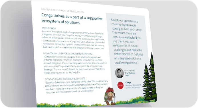 CHAPTER Œá THE SUPPORT OF AN ECOSYSTEM Conga thrives as a part of a supportive Salesforce operates as a ê community of people ecosystem of solutions. looking to help each otherç MEET CONGA This means there are As one of the earliest AppExchange partners õêWeąve been Salesforce integrated since day oneâê says Eric WongâćVP of Marketingöâ Conga resources availableì if you offers a suite of solutions that simplify and automate dataâ documentâ use themâ you can contract and sales processesç Conga also takes advantage of several of Salesforceës partnership optionsâ offering some apps that are natively mitigate risk of future built on the platform and some that integrate in through connectorsçć challenges and make the entire process of building HOW CONGAćLEVERAGES A GROWING ECOSYSTEM êConga was founded as a purposeûbuilt solution to support and an integrated solution a enhance Salesforceâê says Ericç And as the ecosystem of solutions positive experienceçê around has grownâ the surroundingćcommunity has yielded a wealth of resources that Conga and other businesses in the ecosystem can leverageç The end resultè Growth for everyone involvedç êSalesforce ERIC WONG keeps growing and so do weâê says Ericç VP of Marketing Conga CONGAëS ADVICE TO OTHER BUSINESSES êSpeak to Salesforce usersâ Salesforce MVPsâ other ISVsâ and the many Conga resources who are dedicated toward helping Salesforce ISVs succeedâê Document Generation ĺ says EricçćêThere are many people who want to helpì utilize your Contract Management resources and the experience will be a positive oneçê APPEXCHANGEá Place the title of the eûbook in this space