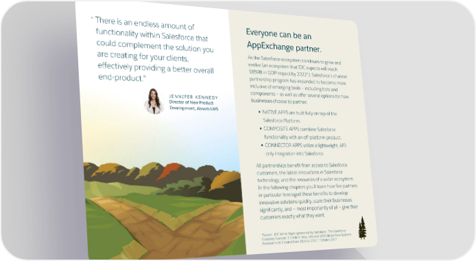 There is an endless amount of ê Everyone can be an functionality within Salesforce that AppExchange partner. could complement the solution you As the Salesforce ecosystem continues to grow and are creating for your clientsâ evolve õan ecosystem that IDC expects will reach Ċ‘Ž’B in GDP impact by ‹‰‹‹Ýöâ Salesforceës channel effectively providing a better overall partnership program has expanded to become more endûproductçê inclusive of emerging tools ú including bots and componentsćú as well as offer several options for how JENNIFER KENNEDY businesses choose to partnerá Director of New Product Development, Absorb LMS NATIVE APPS arećbuiltćfully on top of the Salesforce Platformç COMPOSITE APPSćcombine Salesforce functionality with anćoffûplatform productçć CONNECTOR APPS utilize aćlightweightâ APIû only integration intoćSalesforceç All partnerships benefit from access to Salesforce customersâ the latest innovations in Salesforce technologyâ and the resources of a wider ecosystemçć In the following chapters youëll learn how five partners in particular leveraged these benefits to develop innovative solutions quicklyâ scale their businesses significantlyâ andćú most importantly of allćú give their customers exactly what they wantç ÝSourceá ćIDC White Paper sponsored by Salesforceâ ĂThe Salesforce Economy Forecastá ŒçŒ Million New Jobs and Ċ‘Ž’ Billion New Business Revenue to Be Created from ‹‰Š to ‹‰‹‹âă October ‹‰Š ć