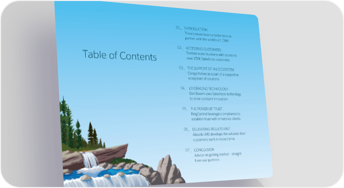 ‰Šî INTRODUCTION Thereës never been a better time to partner with the worldës æŠ CRM ‰‹î ACCESSING CUSTOMERS Tenfold scales business with access to over ŠŽ‰k Salesforce customers Table of Contents ‰Œî THE SUPPORT OF AN ECOSYSTEM Conga thrives as a part of a supportive ecosystem of solutionsć ‰î LEVERAGING TECHNOLOGYć Dell Boomi uses Salesforce technology to drive constant innovation ‰Žî THE POWER OF TRUST RingCentral leverages compliance to establish trust with enterprise clients ‰î DELIVERING RESULTSćFAST Absorb LMS develops the solution their customers want in record time ‰î CONCLUSION Advice on getting startedćú straight from our partners