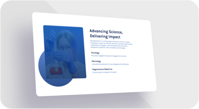 Advancing Science, Delivering Impact We specializes in cutting-edge treatments across multiple therapeutic areas. Our diverse portfolio includes breakthrough medications, biologics, and next-generation therapies designed to address critical healthcare challenges. Oncology Precision-targeted therapies for aggressive cancers Neurology Innovative treatments for neurodegenerative diseases Regenerative Medicine Pioneering cell and gene therapies