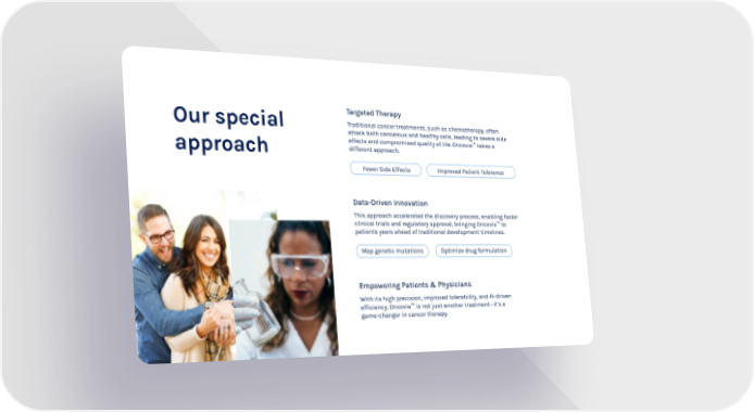Fewer Side Effects Traditional cancer treatments, such as chemotherapy, often attack both cancerous and healthy cells, leading to severe side effects and compromised quality of life. Oncovia™ takes a different approach. Targeted Therapy Improved Patient Tolerance With its high precision, improved tolerability, and AI-driven efficiency, Oncovia™ is not just another treatment—it’s a game-changer in cancer therapy. Empowering Patients & Physicians This approach accelerated the discovery process, enabling faster clinical trials and regulatory approval, bringing Oncovia™ to patients years ahead of traditional development timelines. Map genetic mutations Data-Driven Innovation Optimize drug formulation Our special approach