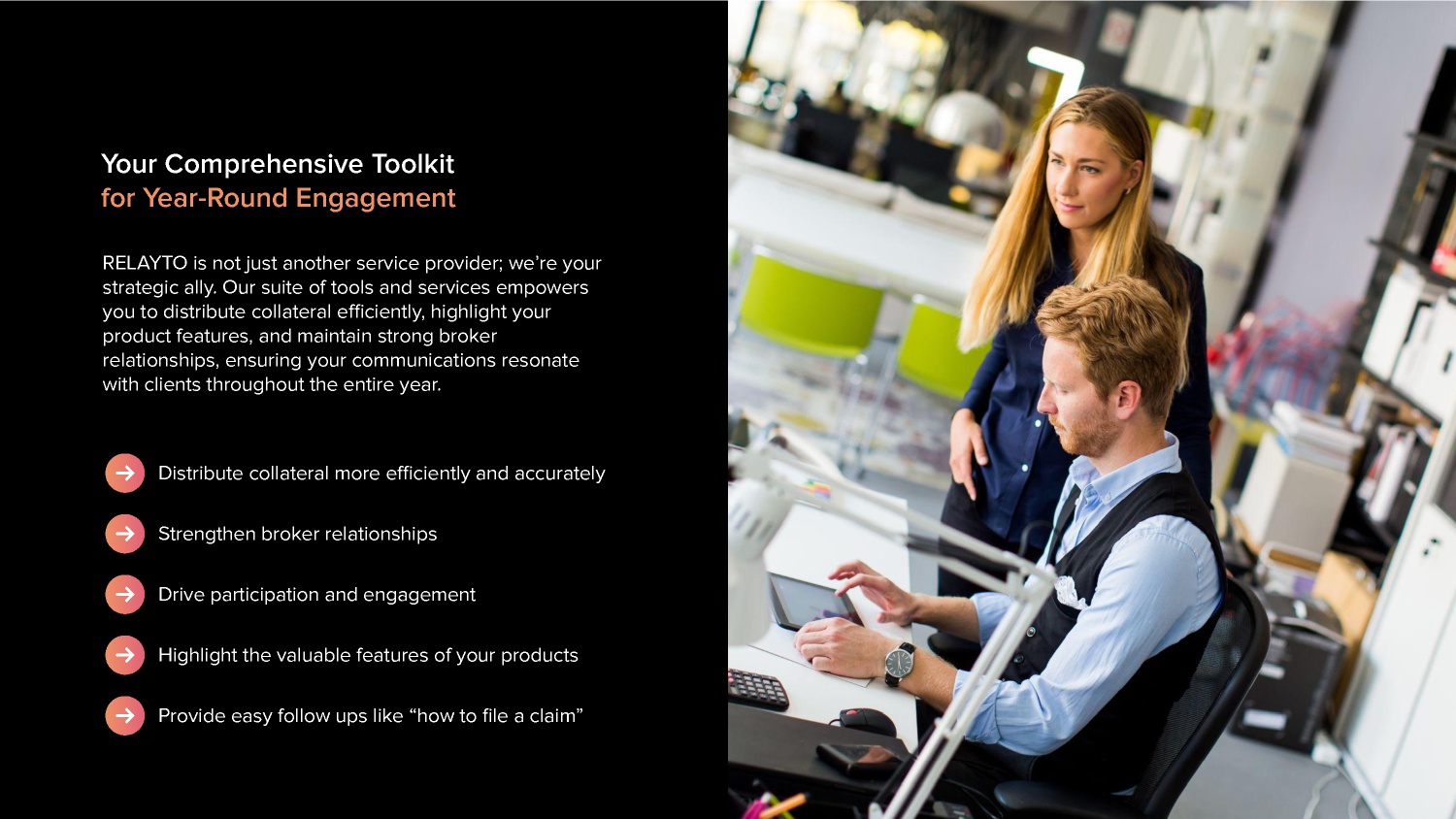 Your Comprehensive Toolkit for Year-Round Engagement RELAYTO is not just another service provider; we’re your strategic ally. Our suite of tools and services empowers you to distribute collateral efficiently, highlight your product features, and maintain strong broker relationships, ensuring your communications resonate with clients throughout the entire year. Distribute collateral more efficiently and accurately Strengthen broker relationships Drive participation and engagement Highlight the valuable features of your products Provide easy follow ups like “how to file a claim”