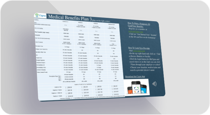 Image result for cigna logo Medical Benefits Plan 3(plan on the right center) How To Print a Temporary ID CIGNA $3200 H.S.A $2000Ded $3000Ded $4000Ded HMO Card/View Benefits: HRA N/A EE-1st $500; EE-1st $1000; EE-1st $1000; -Register as a member at (must submit reimbursement form) Company next $1000 Company next $1000 Company next $1000 www.myCigna.com HSA-ER Funding $500 January N/A N/A N/A $500 July -Click on