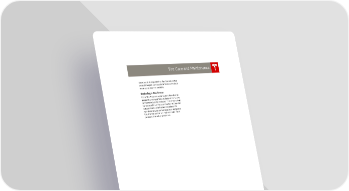 book.book Page 7 Friday, July 19, 2013 12:53 PM Tire Care and Maintenance detected, it is possible that the tire sensor has been damaged. Contact Tesla to have the fault repaired as soon as possible. Replacing a Tire Sensor If the Tire Pressure warning indicator displays frequently, contact Tesla to determine if a tire sensor needs to be replaced. Tire sensors must be replaced by a Tesla service technician who can perform a brief setup procedure. If a non-Tesla service center repairs or replaces a tire, the tire sensor will not work until Tesla performs the setup procedure. MAINTENANCE 7.7