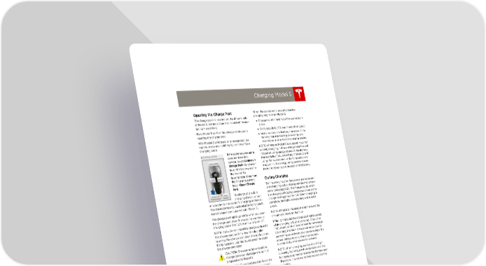 book.book Page 5 Friday, July 19, 2013 12:53 PM Charging Model S Charging Model S When the connector is properly inserted, Opening the Charge Port The charge port is located on the driver’s side charging begins after Model S: of Model S, behind a door that is part of the rear • Engages a latch that holds the connector in tail light assembly. place. Park Model S so that the charge cable easily • Shifts into Park (if it was in any other gear). reaches the charge port. • Heats or cools the Battery, if needed. If the With Model S unlocked, or a recognized key Battery requires heating or cooling, you nearby, press and hold the button on a Tesla may notice a delay before charging begins. charging cable. NOTE: Whenever Model S is plugged in but not If the cable you are using actively charging, it draws energy from the wall does not have this instead of using energy stored in the Battery. button, touch Controls > For example, if you are sitting in Model S and Charge Port. Or, you can using the touchscreen while it is parked and touch the battery icon at plugged in, the energy being used is drawn the top of the from the power outlet instead of the Battery. touchscreen, then from the Charging screen, During Charging touch Open Charge During charging, the charge port pulses green Port. and charging status displays on the instrument To charge at a public panel (see page 6.8). The frequency at which charging station, attach the charge port’s light pulses slows down as the an adapter to the station’s charging connector. charge level approaches full. When charging is The most commonly used adapter(s) for each complete, the light stops pulsing and is solid market region are supplied with Model S. green. The charge port lights up white when you open NOTE: If Model S is locked, the light around the the charge port door. If you do not connect a charge port does not light up. charging cable, the light eventually turns off. If the light around the charge port lights up red NOTE: If you do not insert the charge cable into while charging, a fault is detected. Check the the charge port within a few minutes after instrument panel or touchscreen for a message opening the charge port door, the latch closes. describing the fault. A fault can occur due to If this happens, use the touchscreen to open something as common as a power outage. If a the charge port door. power outage occurs, charging resumes CAUTION: The connector end of the automatically when power is restored. charge cable can damage the paint if NOTE: When charging, particularly at high dropped onto Model S. currents, the refrigerant compressor and the CAUTION: Do not attempt to force the fan operate as needed to keep the Battery cool. charge port door open. Doing so can Therefore, it is normal to hear sounds during damage the latch. A damaged latch charging. cannot hold the door closed. Stopping Charging Plugging In You can stop charging at any time by If desired, use the touchscreen to change the disconnecting the charge cable or touching charge limit and the charging current (see Stop Charging on the touchscreen. page6.7). To disconnect the charge cable: If you are using the Mobile Connector, plug it 1. Press the button on a Tesla connector to into the power outlet before plugging it into release the latch. Model S. 2. Pull the connector from the charge port. Align the connector to the charge port and 3. Push the charge port door closed. insert fully. CHARGING 6.5