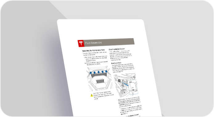 book.book Page 16 Friday, July 19, 2013 12:53 PM Fluid Reservoirs Fluid Reservoirs Fluid Reservoirs Removing the Maintenance Panel Checking Battery Coolant To access fuses and check fluid levels, remove If the quantity of fluid in the cooling system the maintenance panel: drops below the recommended level, the 1. Pull the rear edge of the maintenance panel instrument panel displays a warning message. upward to release the five clips that hold Stop Model S as soon as safety permits and call the panel in place. Roadside Assistance to have Model S 2. Maneuver the maintenance panel toward transported to Tesla. the windshield to remove. Fluid Level Check Tesla checks the Battery coolant level at the regularly scheduled maintenance intervals. To check it yourself, park Model S on level ground. When ModelS is cool, remove the maintenance panel (see page 7.16). CAUTION: The maintenance panel protects the front trunk from water. When re-attaching, make sure it is fully seated. Check the fluid level visually by looking at the outside marks on the side of the reservoir. DO NOT REMOVE THE FILLER CAP AND DO NOT ADD FLUID. Doing so can result in damage not covered by the warranty. The fluid level should be between the MIN and the MAX marks. If you notice that the fluid level has dropped significantly, contact Tesla before using Model S. Topping Up the Battery Coolant Under no circumstances should you add coolant. If the instrument panel warns you that the fluid level is low, contact Tesla immediately. To maximize the performance and life of the Battery, the cooling system uses a specific type of G-48 ethylene-glycol coolant (HOAT). Contact Tesla for more specific information about the coolant. 7.16 MODEL S OWNERS MANUAL