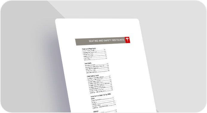 book.book Page 1 Friday, July 19, 2013 12:53 PM SEATING AND SAFETY RESTRAINTS Front and Rear Seats Correct Driving Position................................ 3.2 Adjusting the Driver’s Seat........................... 3.2 Folding Rear Seats........................................... 3.3 Raising Rear Seats........................................... 3.3 Head Supports................................................... 3.3 Seat Covers......................................................... 3.3 Seat Belts Wearing Seat Belts......................................... 3.4 Wearing Seat Belts When Pregnant........ 3.4 Seat Belt Pre-tensioners................................ 3.5 Testing Seat Belts............................................ 3.5 Seat Belt Warnings......................................... 3.6 Child Safety Seats Guidelines for Seating Children.................. 3.7 Choosing a Child Safety Seat...................... 3.7 Seating Larger Children................................. 3.8 Installing Child Safety Seats......................... 3.8 Installing Seat Belt Retained Child Seats 3.8 Installing ISOFIX Child Seats....................... 3.9 Attaching Upper Tether Straps................ 3.10 Testing a Child Safety Seat........................ 3.10 Warnings - Child Safety Seats................... 3.10 Tesla Built In Rear Facing Child Seats Usage Restrictions.......................................... 3.11 Opening............................................................... 3.11 Folding................................................................ 3.12 Seating a Child................................................ 3.13 Warnings - Tesla Child Seats..................... 3.14 Airbags Location of Airbags....................................... 3.15 How the Airbags Work................................. 3.16 Types of Airbags............................................ 3.16 Disabling the Front Passenger Airbag... 3.17 Inflation Effects............................................... 3.18 Airbag Warning Indicator........................... 3.18 Airbag Warnings............................................. 3.18 3.1