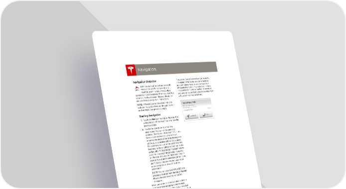 book.book Page 20 Friday, July 19, 2013 12:53 PM Navigation Navigation Navigation If you press Cancel before Navigation starts, Navigation Overview the popup remains and you can choose to With the navigation option, onboard navigate when ready, or you can specify a maps allow you to navigate to any different destination. The popup will include location, even in areas where a data the destination’s phone number (if available) connection is not available. When you specify a and you can touch Call to dial the number from location, the touchscreen displays the route a Bluetooth-connected phone. and provides turn-by-turn instructions. NOTE: If Model S is not equipped with the optional navigation feature, the app’s icon is labeled Maps (see previous page). Starting Navigation 1. Touch the Nav icon to display the map. For a description of the map’s features, see the previous page. 2. Touch the search bar to enter the destination. You can enter complete address information, then touch GO. If you have a data connection, you can start entering the destination, then choose one of the auto-complete entries that appear. For example, you can enter just the street, business name, or category (such as hotels, coffee, etc). A list of matching destinations and their corresponding pushpins appear on the map and you can then touch any list item or its pushpin to start navigation. If you don’t have a data connection, you must enter complete and exact location information. NOTE: You can also touch PLACES and choose a location from the list of Recent Places, Recent Searches, or Visited Chargers. When you enter or choose a destination, a destination popup appears on the map, displaying information about your selected destination. Navigation starts automatically if you do not touch Cancel within 5 seconds. 5.20 MODEL S OWNERS MANUAL