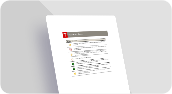 book.book Page 10 Friday, July 19, 2013 12:53 PM Instrument Panel Instrument Panel Indicator Description An ABS (Anti-lock Braking System) fault is detected. See page 4.20. Contact Tesla immediately. A brake system fault is detected or the brake fluid level is low. See page 4.20. Contact Tesla immediately. Tire pressure warning. The pressure of a tire is out of range. If a fault with the Tire Pressure Monitoring System (TPMS) is detected, the indicator flashes. For a TPMS fault, contact Tesla. See page 7.3. A door or trunk is open. See page 2.4. Flashes green when the left turn signal is operating. Both turn signal indicators flash green when the hazard warning flashers are operating. Flashes green when the right turn signal is operating. Both turn signal indicators flash green when the hazard warning flashers are operating. Model S is in Tow mode and can roll freely. It does not automatically shift into Park when you exit. See page 9.3. 4.10 MODEL S OWNERS MANUAL