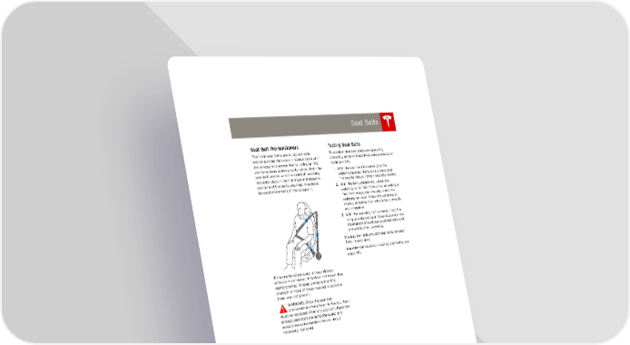 book.book Page 5 Friday, July 19, 2013 12:53 PM Seat Belts Seat Belt Pre-tensioners Testing Seat Belts The front seat belts are equipped with To confirm that seat belts are operating pre-tensioners that work in conjunction with correctly, perform these three simple checks on the airbags in a severe frontal collision. The each seat belt. pre-tensioners automatically retract both the 1. With the seat belt fastened, give the seat belt anchor and the seat belt webbing, webbing nearest the buckle a quick pull. reducing slack in both the lap and diagonal The buckle should remain securely locked. portions of the belts, resulting in reduced 2. With the belt unfastened, unreel the forward movement of the occupant. webbing to its limit. Check that unreeling is free from snags, and visually check the webbing for wear. Allow the webbing to retract, checking that retraction is smooth and complete. 3. With the webbing half unreeled, hold the tongue plate and pull forward quickly. The mechanism should lock automatically and prevent further unreeling. If a seat belt fails any of these tests, contact Tesla immediately. For information about cleaning seat belts, see page7.13. If the pre-tensioners and airbags did not activate in an impact, this does not mean they malfunctioned. It usually means that the strength or type of force needed to activate them was not present. WARNING: Once the seat belt pre-tensioners have been activated, they must be replaced. After any accident, have the airbags, seat belt pre-tensioners and any associated components checked and, if necessary, replaced. SEATING AND SAFETY RESTRAINTS 3.5
