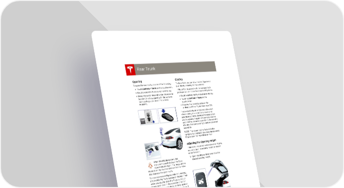 book.book Page 8 Friday, July 19, 2013 12:53 PM Rear Trunk Rear Trunk Rear Trunk Opening Closing To open the rear trunk, do one of the following: To close the trunk, pull down on the liftgate and • Touch Controls > Trunk on the touchscreen. push firmly, ensuring it is fully closed. • Double-click the Trunk button on the key. If Model S is equipped with the optional tech • Press the switch located under the exterior package, you can close the powered liftgate by: handle (if not equipped with the optional • Double-clicking the trunk button on the key. tech package, you must first unlock • Touching Controls > Trunk on the ModelS). touchscreen. • Pressing the switch located on the underside of the liftgate (see page 2.8). If a powered liftgate senses an obstruction when closing, it automatically opens and sounds two chimes. Remove the obstruction and try closing it again. If it cannot close the second time, powered operation is temporarily disabled. Manually closing it restores powered operation. NOTE: The power closing feature is also temporarily disabled if you leave the powered liftgate open for more than an hour. Adjusting the Opening Height If Model S is equipped with a powered liftgate, you can adjust its opening height to make it easier to reach: When the liftgate is open, the 1. Open the liftgate, then lower it to the instrument panel displays the Door desired opening height. Open indicator light. The image of the Model S on the touchscreen Controls window also displays the open trunk. To stop a powered liftgate while it is moving, single-click the Trunk button on the key. Then, when you double-click the Trunk button, it moves again, but in the opposite direction (provided it was not almost entirely open or closed when you stopped it). For example, if you single-click to stop the liftgate while it is opening, when you double-click, it closes. To open the trunk in the unlikely situation in which Model S has no electrical power, see page2.9. 2. Press and hold the button on the underside of the liftgate for 2 seconds until you hear a confirmation beep. 3. Confirm that you have set it to the desired height by closing the liftgate, then reopening it. 2.8 MODEL S OWNERS MANUAL
