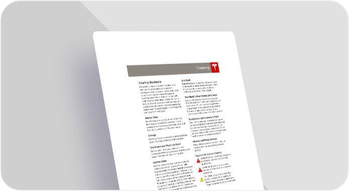 book.book Page 13 Friday, July 19, 2013 12:53 PM Cleaning Cleaning the Interior Seat Belts Frequently inspect and clean the interior to Extend the belts to wipe. Do not use any type maintain its appearance and to prevent of detergent or chemical cleaning agent. Allow premature wear. If possible, immediately wipe the belts to dry naturally while extended, up spills and remove marks. For general preferably away from direct sunlight. cleaning, wipe interior surfaces using a soft Tesla Built In Rear Facing Child Seats cloth (such as micro fiber) dampened with a mixture of warm water and mild non-detergent Vacuum the seats to remove any loose dirt. cleaner (test all cleaners on a concealed area Wipe the seats with a soft cloth dampened with before use). To avoid streaks, dry immediately warm water. You can also use an upholstery with a soft lint-free cloth. cleaner designer for automotive use. Extend the belts to wipe. Allow the belts to dry Interior Glass naturally, preferably away from direct sunlight. Do not scrape, or use any abrasive cleaning Touchscreen and Instrument Panel fluid on glass or mirrored surfaces. This can damage the reflective surface of the mirror and Clean the touchscreen and instrument panel the heating elements in the rear window. using a soft lint-free cloth specifically designed to clean monitors and displays. Do not use Airbags cleaners (such as a glass cleaner) and do not Do not allow any substance to enter an airbag use a wet wipe or a dry statically-charged cloth cover. This could affect correct operation. (such as a recently washed microfiber). Dashboard and Plastic Surfaces Chrome and Metal Surfaces Do not polish the upper surfaces of the Polish, abrasive cleaners or hard cloths can dashboard. Polished surfaces are reflective and damage the finish on chrome and metal could interfere with your driving view. surfaces. Leather Seats Cautions for Interior Cleaning Leather is prone to dye-transfer which can WARNING: If you notice any damage on cause discoloration, particularly on light an airbag or seat belt, contact Tesla colored leather. White and tan leather is coated immediately. with an anti-soiling treatment. Wipe spills as WARNING: Do not allow any water, soon as possible using a soft cloth moistened cleaners, or fabric to enter a seat belt with warm water and non-detergent soap. mechanism. Wipe gently in a circular motion. Then wipe dry CAUTION: Using solvents (including using a soft, lint-free cloth. Using detergents or alcohol), bleach, citrus, naphtha, or commercially available leather cleaners and silicone based products or additives on conditioners is not recommended because they interior components can cause damage. can discolor or dry out the leather. Cloth Seats Wipe spills as soon as possible using a soft cloth moistened with warm water and non-detergent soap. Wipe gently in a circular motion. Then wipe dry using a soft, lint-free cloth. Vacuum the seats as needed to remove any loose dirt. Carpets Avoid over-wetting carpets. For heavily soiled areas, use a diluted upholstery cleaner. MAINTENANCE 7.13