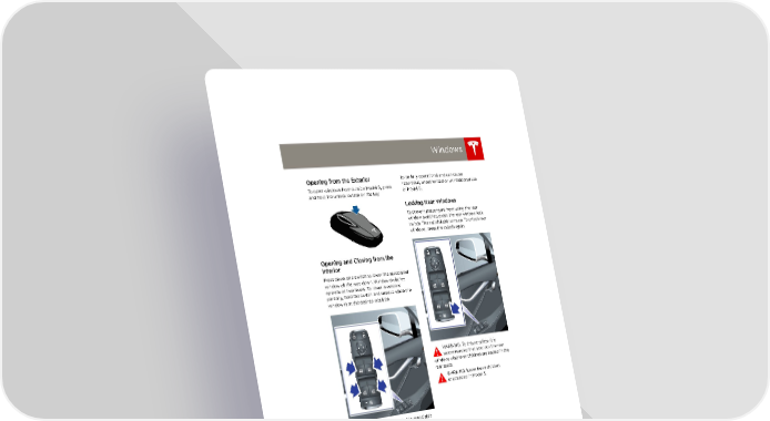 book.book Page 7 Friday, July 19, 2013 12:53 PM Windows Windows to be fully operational and can cause Opening from the Exterior To open windows from outside Model S, press hazardous, unauthorized or unintentional use and hold the unlock button on the key. of Model S. Locking Rear Windows To prevent passengers from using the rear window switches, press the rear window lock switch. The switch light turns on. To unlock rear windows, press the switch again. Opening and Closing from the Interior Press down on a switch to lower the associated window all the way down. Window switches operate at two levels. To lower a window partially, hold the switch and release when the window is at the desired position. WARNING: To ensure safety, it is recommended that you lock the rear windows whenever children are seated in the rear seats. WARNING: Never leave children unattended in Model S. Similarly, pull a switch to raise the associated window. This also operates at two levels—when raising, hold the switch and release when the window is at the desired position. WARNING: Before closing a power window, it is the driver’s responsibility to ensure that all occupants, especially children, do not have any body parts extended through the window’s opening. Failure to do so can cause serious injury. WARNING: When leaving Model S, always take your key with you. Leaving the key in Model S allows all doors, windows, and controls OPENING AND CLOSING 2.7