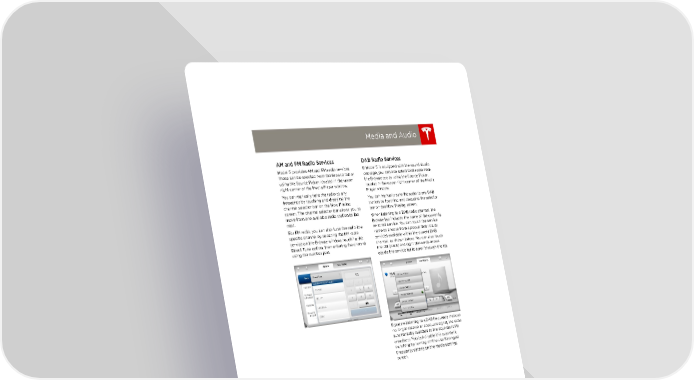 book.book Page 13 Friday, July 19, 2013 12:53 PM Media and Audio AM and FM Radio Services DAB Radio Services Model S provides AM and FM radio services. If Model S is equipped with the sound studio These can be selected from the Browse tab or package, you can also select DAB radio from using the Source Picker, located in the upper the Browse tab or using the Source Picker, right corner of the Media Player window. located in the upper right corner of the Media You can manually tune the radio to any Player window. frequency by touching and dragging the You can manually tune the radio to any DAB channel selector bar on the Now Playing station by touching and dragging the selector screen. The channel selector bar allows you to bar on the Now Playing screen. move from one available radio station to the When listening to a DAB radio channel, the next. Browse tab includes the name of the currently For FM radio, you can also tune the radio to a selected service. You can touch the service specific channel by selecting the FM radio name to choose from a popup that lists all service on the Browse window, touching the services available within the current DAB Direct Tune option, then entering the channel channel, as shown below. You can also touch using the number pad. the left (back) and right (forward) arrows beside the service list to scroll through the list. If you are listening to a DAB frequency that can no longer receive an adequate signal, the radio automatically switches to the equivalent FM broadcast. You can disable this automatic switching by turning off the Use Strongest Frequency setting on the media settings screen. USING THE TOUCHSCREEN 5.13