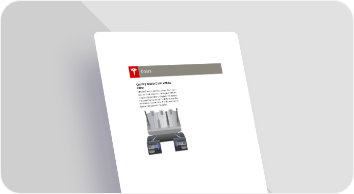 book.book Page 6 Friday, July 19, 2013 12:53 PM Doors Doors Opening Interior Doors with No Power If Model S has no electrical power, front doors open as usual using the interior door handles. To open the rear doors, fold back the edge of the carpet below the rear seats to expose the mechanical release cable. Pull the mechanical release cable toward the center. 2.6 MODEL S OWNERS MANUAL