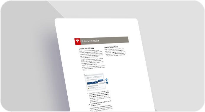 book.book Page 24 Friday, July 19, 2013 12:53 PM Software Updates Software Updates Software Updates Loading New Software Viewing Release Notes Model S updates its software wirelessly, When a software update is complete, learn providing new features throughout your term about the new features by displaying the of ownership. The first time you enter ModelS release notes. To display release notes at any after an update is made available, a scheduling time touch the Tesla “TŽ at the top center of window displays on the touchscreen. the touchscreen, then touch Release Notes. NOTE: A software update can take up to two hours to complete (an estimated time is provided). Model S must be in Park when the new software is being installed. When a software update is available, a yellow clock icon appears on the touchscreen’s status bar. 1. Touch the up and down arrows to change the installation time (if necessary). Then touch Set For This Time to schedule the installation. Once scheduled, the yellow clock icon on the touchscreen’s status bar becomes white. 2. Touch Install Now to immediately start the installation process. You can reschedule the installation any time before it begins. To do so, touch the clock icon on the touchscreen’s status bar to display the update window. If Model S is charging when the software update begins, charging stops. Charging resumes automatically when the update is complete. If you are driving Model S at the scheduled update time, the update is canceled and you need to reschedule. If the touchscreen displays a message indicating that a software update was not successfully completed, contact Tesla. 5.24 MODEL S OWNERS MANUAL
