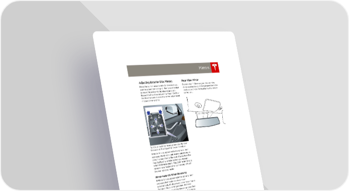 book.book Page 5 Friday, July 19, 2013 12:53 PM Mirrors Mirrors Adjusting Exterior Side Mirrors Rear View Mirror Press the button associated with the mirror you Except when in Reverse gear, the rear view want to adjust (left or right), then press the dial mirror automatically dims in proportion to the to move the mirror to the desired position. level of glare from the headlights of a vehicle Repeat for the other side mirror. Touch SAVE on behind you. the touchscreen to save the mirror adjustment in your driver profile. To fold an exterior mirror, place your hand on the back of it and push it toward the door. If Model S is equipped with the optional tech package, the driver’s side mirror automatically dims in proportion to the level of glare from the headlights of a vehicle behind you (except when in Reverse gear). Also, both exterior side mirrors have heaters that turn on and off with the rear window heater. Mirror Auto-tilt When Reversing If Model S is equipped with the optional tech package, both exterior mirrors can automatically tilt downward when backing up. To adjust the auto-tilt position, shift into Reverse, then adjust the mirrors as described above (press the button associated with the mirror you want to adjust, then press the dial to move the mirror to the desired position). Touch SAVE on the touchscreen to save the mirror adjustment in your driver profile. When you shift back into Drive, the mirrors tilt back to their normal (upward) position. But now that you have adjusted them for backing up, they automatically tilt to the selected downward position whenever you shift into Reverse. You can turn the auto-tilt feature on or off using the touchscreen, Touch Controls > Settings > Mirror Auto-Tilt. DRIVING 4.5