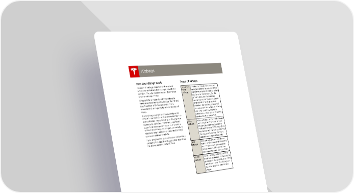 book.book Page 16 Friday, July 19, 2013 12:53 PM Airbags Airbags How the Airbags Work Types of Airbags Inflation of airbags depends on the rate at Advanced The front airbags are advanced which the vehicle’s cabin changes speed in a front airbags designed to reduce airbag collision. The rate of deceleration determines airbags related injuries to children or small whether airbags inflate. adults who ride in front. On the Airbags inflate instantly with considerable driver’s side, the front airbag force accompanied by a loud noise. The inflated works with a seat position sensor bag, together with the seat belts, limits that adjusts the inflation level movement of occupants to reduce the risk of based on the seating position of injury. the occupant. For safety of infants Front airbags are not ordinarily designed to and small children, the front inflate in rear collisions, rollovers, minor front or passenger airbag can be disabled side collisions, heavy braking, or driving over as described on page 3.17. bumps and potholes. Therefore, significant Knee Knee airbags and the front airbags superficial damage can occur to the vehicle airbags work together. The knee airbags without the airbags inflating or, conversely, a limit the forward motion of the relatively small amount of structural damage front seat occupants by restricting can cause airbags to inflate. leg movement, thereby positioning If you are planning to modify your vehicle for a the occupants so that the front person with disabilities in a way that may affect airbags work more effectively. the airbag system, contact Tesla. Side Side airbags protect the thorax airbags region of the torso and the pelvis and inflate only if a severe side impact occurs. Airbags on the non-impacted side do not inflate. Curtain Curtain airbags help protect the airbags head and ordinarily inflate only if a severe side impact occurs or if the vehicle rolls over. The airbags on the non-impacted side do not inflate. 3.16 MODEL S OWNERS MANUAL