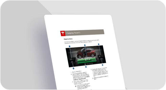 book.book Page 8 Friday, July 19, 2013 12:53 PM Charging Model S Charging Model S Charging Status The following illustration is provided for demonstration purposes only and may vary slightly depending on the software version and market region of your Model S. 1. Charging rate per hour. 5. Charging status information displays here. 2. Total estimated driving distance (or For example, if Model S is charging, it energy) available. Instead of driving displays the time remaining until fully distance as shown here, you can change charged at the currently selected charge settings to display the amount of energy level. When scheduled charging is set for available instead. To do so, touch Controls a location, it displays when charging will > Settings > Language & Units. start. 3. Current being supplied/Total current 6. Voltage being supplied by the charging available from the connected power cable. supply (see page 6.7). If connected to a 3-phase power supply, the available current represents the current per phase and the 3-phase symbol is displayed. 4. Estimated increase in driving distance (or energy) achieved so far in this charging session. Instead of driving distance as shown here, you can change settings to display the amount of energy achieved instead. To do so, touch Controls > Settings > Language & Units. 6.8 MODEL S OWNERS MANUAL