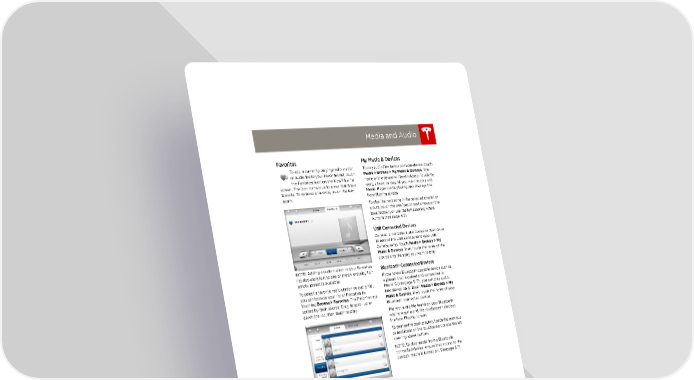 book.book Page 15 Friday, July 19, 2013 12:53 PM Media and Audio Favorites My Music & Devices To add a currently playing radio station To play audio files from a portable device, touch or audio file to your Favorites list, touch Media > Browse > My Music & Devices. The the Favorites icon on the Now Playing name of the device will be displayed. Touch the screen. The icon turns blue to show that it is a song, album, or playlist you want to play and favorite. To remove a favorite, touch the icon Media Player starts playing and displays the again. Now Playing screen. To play the next song in the selected playlist or album, touch the previous or next arrows on the touchscreen, or use the left steering wheel buttons (see page 4.3). USB Connected Devices Connect a portable audio device or flash drive to one of the USB connections (see USB Connections). Touch Media > Browse > My Music & Devices, then touch the name of the device and the song you want to play. NOTE: Adding a radio station to your Favorites Bluetooth® Connected Devices list also assigns it to one of the six presets, if an If you have a Bluetooth-capable device such as empty preset is available. a phone, that is paired and connected to To select a favorite radio station or audio file, ModelS (see page 5.17), you can play audio you can browse your list of Favorites by files stored on it. Touch Media > Browse > My touching Browse > Favorites. The Favorites are Music & Devices, then touch the name of your sorted by their source. Drag to scroll up or Bluetooth connected device. down the list, then touch to play. The first audio file found on your Bluetooth begins playing and the touchscreen displays the Now Playing screen. To change the track playing, touch the previous or next icons on the touchscreen, or use the left steering wheel buttons. NOTE: To play media from a Bluetooth connected device, ensure that access to the device’s media is turned on. See page 5.17. You can also scroll through your Favorites list using the left steering wheel buttons (see page4.3), To remove a favorite from the list, touch the associated X. NOTE: If you remove a favorite radio station or channel that is assigned to a preset, it is also removed from the preset. USING THE TOUCHSCREEN 5.15