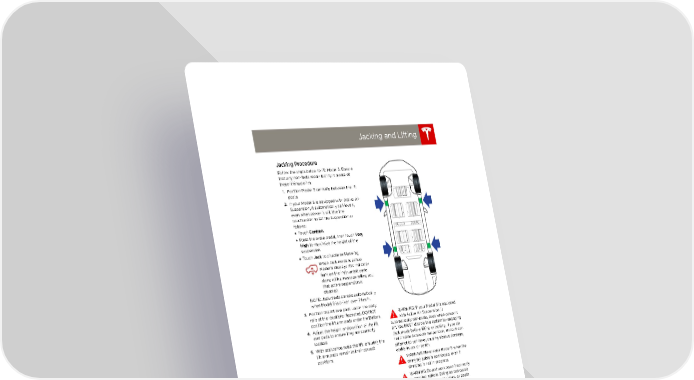 book.book Page 23 Friday, July 19, 2013 12:53 PM Jacking and Lifting Jacking and Lifting Jacking Procedure Follow the steps below to lift Model S. Ensure that any non-Tesla repair facility is aware of these lifting points. 1. Position Model S centrally between the lift posts. 2. If your Model S is equipped with Active Air Suspension, it automatically self-levels, even when power is off. Use the touchscreen to set the suspension as follows: • Touch Controls. • Press the brake pedal, then touch Very High to maximize the height of the suspension. • Touch Jack to disable self-leveling. When Jack mode is active, ModelS displays this indicator light on the instrument panel, along with a message telling you that active suspension is disabled. NOTE: Jack mode cancels automatically when ModelS is driven over 7 km/h. 3. Position the lift arm pads under the body rails at the locations illustrated. DO NOT WARNING: If your Model S is equipped position the lift arm pads under the Battery. with Active Air Suspension, it 4. Adjust the height and position of the lift automatically self-levels, even when power is arm pads to ensure they are correctly off. You MUST disable this system by engaging located. Jack mode before lifting or jacking. If you do 5. With assistance, raise the lift, ensuring the not disable Active Air Suspension, Model S can lift arm pads remain in their correct attempt to self-level, causing serious damage, positions. bodily injury, or death. WARNING: Never raise Model S when the charging cable is connected, even if charging is not in progress. WARNING: Do not work on an incorrectly supported vehicle. Doing so can cause serious damage, bodily injury, or death. CAUTION: DO NOT lift from under the Battery. Place the lift arm pads under the body rails only. The locations illustrated are the only approved lifting points for Model S. Lifting at any other points can cause damage. Damage caused by lifting Model S is not covered by the warranty. MAINTENANCE 7.23