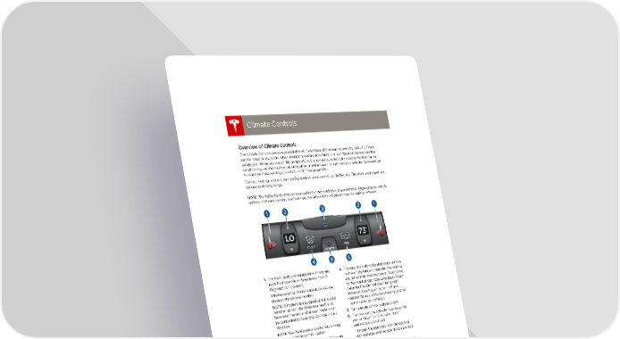 book.book Page 8 Friday, July 19, 2013 12:53 PM Climate Controls Climate Controls Climate Controls Overview of Climate Controls The climate controls are always available at the bottom of the touchscreen. By default, climate control is set to Auto On, which maintains optimum comfort in all but the most severe weather conditions. When you adjust the temperature, the system automatically adjusts the heating, air conditioning, air distribution, air circulation, and fan speed to maintain your selected temperature. To override these settings, touch Auto On (see page 5.9). The fan, heating, and air conditioning systems are powered by the Battery. Therefore, prolonged use decreases driving range. NOTE: The following illustration is provided for demonstration purposes only. Depending on vehicle options, software version, and settings, the information displayed may be slightly different. 1. The front seats are equipped with heating 4. The windshield defroster distributes air flow pads that operate at three levels from 3 to the windshield and operates the heating (highest) to 1 (lowest). and fan at their maximum level. Touch once When operating, the indicator turns red and for Normal Defrost (icon turns blue). Touch displays the setting number. twice for Max Defrost (icon turns red). NOTE: If Model S is equipped with the cold When on, touch again to turn off and weather option, the three rear seats also restore the air distribution, heating, and fan have seat heaters and all seat heaters can to their previous settings. be controlled by touching Controls > Cold 5. Turn climate control system on/off. Weather. 6. The rear window defroster warms up the NOTE: Seat heaters use less Battery energy rear window* for 15 minutes, then than the climate control system. automatically shuts off. 2. Touch the up or down arrow to set the cabin *If Model S is equipped with the optional temperature (from LO, 17° C to HI, 32° C). To tech package, exterior side mirrors are also apply a temperature setting to both the heated. driver and passenger side at the same time, WARNING: To avoid burns resulting from touch SYNC TEMP on the temperature prolonged use, individuals who have popup that appears when you touch an peripheral neuropathy, or whose capacity to arrow. feel pain is limited because of diabetes, age, NOTE: You can display temperature in neurological injury, or some other condition, o o should exercise caution when using the climate either F or C (Controls > Settings > Language & Units). control system and seat heaters. 3. Automatic/Manual climate control (see page5.9). 5.8 MODEL S OWNERS MANUAL