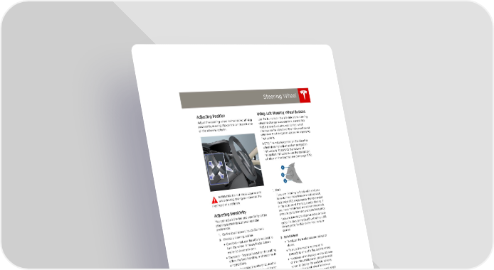 book.book Page 3 Friday, July 19, 2013 12:53 PM Steering Wheel Steering Wheel Adjusting Position Using Left Steering Wheel Buttons Adjust the steering wheel to the desired driving Use the buttons on the left side of the steering position by moving the control on the left side wheel to change radio stations, control the of the steering column. media player’s volume, and control what displays on the left side of the instrument panel whenever the Navigation app is not displaying instructions. NOTE: The volume control on the steering wheel does not adjust spoken navigation instructions. To control the volume of navigation instructions, use the navigation window on the touchscreen (see page 5.19). WARNING: Do not make adjustments 1. Next while driving. Doing so increases the If you are listening to local radio and you likelihood of a collision. have defined more than one radio preset, (see page 5.12) press to play the next preset Adjusting Sensitivity in the radio band that is currently playing. If You can adjust the feel and sensitivity of the you have not defined more than one preset, steering system to suit your personal press to go to the next available frequency. preference: If you are listening to Internet radio, or to an audio file on a connected Bluetooth or USB 1. On the touchscreen, touch Controls. device, press to skip to the next song or 2. Choose a steering option: station. • Comfort - reduces the effort required to 2. Scroll Wheel turn the wheel. In town, Model S feels • To adjust the media volume, roll up or easier to drive and park. down. • Standard - Tesla believes that this setting • To mute the media volume, or to offers the best handling and response in pause/play an audio file, tap the wheel. all conditions. • Sport - Increases the effort required to • To choose what displays on the left side turn the wheel. When driving at higher of the instrument panel, press the scroll speeds, Model S feels more responsive. wheel to display the available options. Then roll the scroll wheel to browse The only way to really know which option you through the options. Tap the scroll wheel like best is to try them. when the option you want is selected. 3. Previous Same as described above for Next, except it skips to the previous song or station. NOTE: Regardless of how you customize the left side of the instrument panel, it automatically changes to display navigation instructions (if applicable), or to let you know if a door or trunk is open when Model S is in a driving gear. DRIVING 4.3