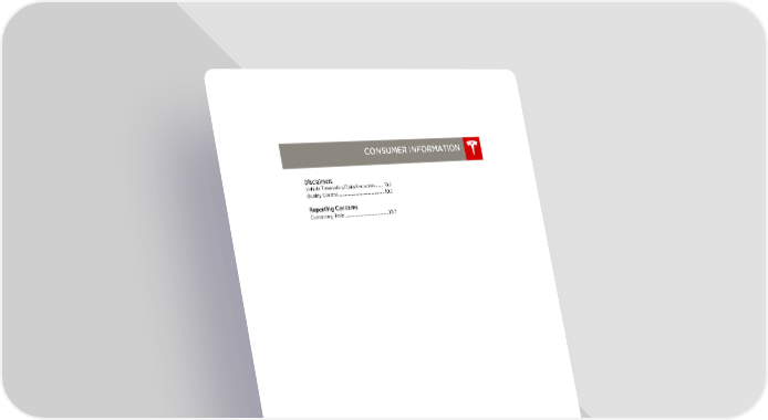 book.book Page 1 Friday, July 19, 2013 12:53 PM CONSUMER INFORMATION Disclaimers Vehicle Telematics/Data Recorders....... 10.2 Quality Control................................................ 10.2 Reporting Concerns Contacting Tesla............................................. 10.3 10.1